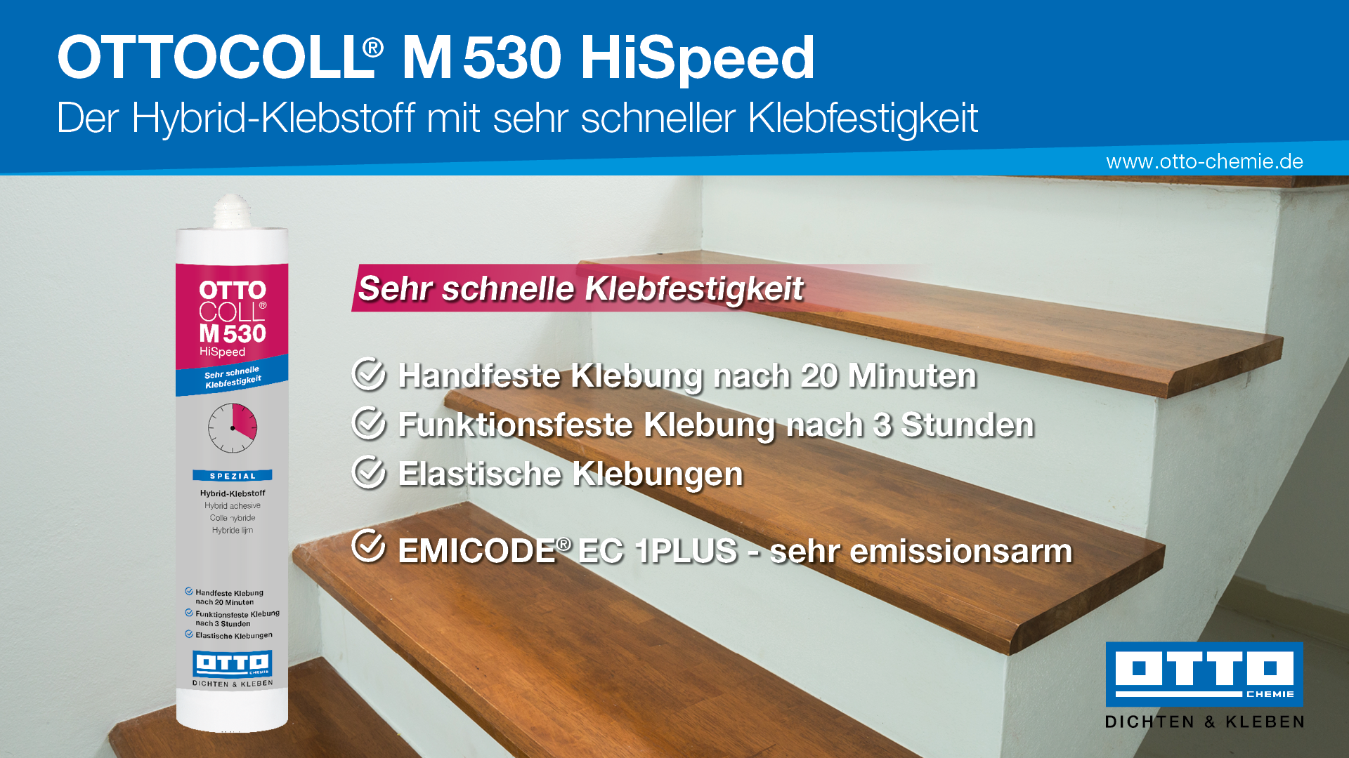 Der Hybrid-Klebstoff mit sehr schneller Klebfestigkeit OTTOCOLL® M 530 ist die perfekte Lösung für Klebungen im Innen- und Außenbereich, wo es schnell gehen muss. Die Klebung ist bereits nach 20 Minuten handfest, nach 3 Stunden Funktionsfest. Damit ist eine schnelle Weiterarbeit gewährleistet.