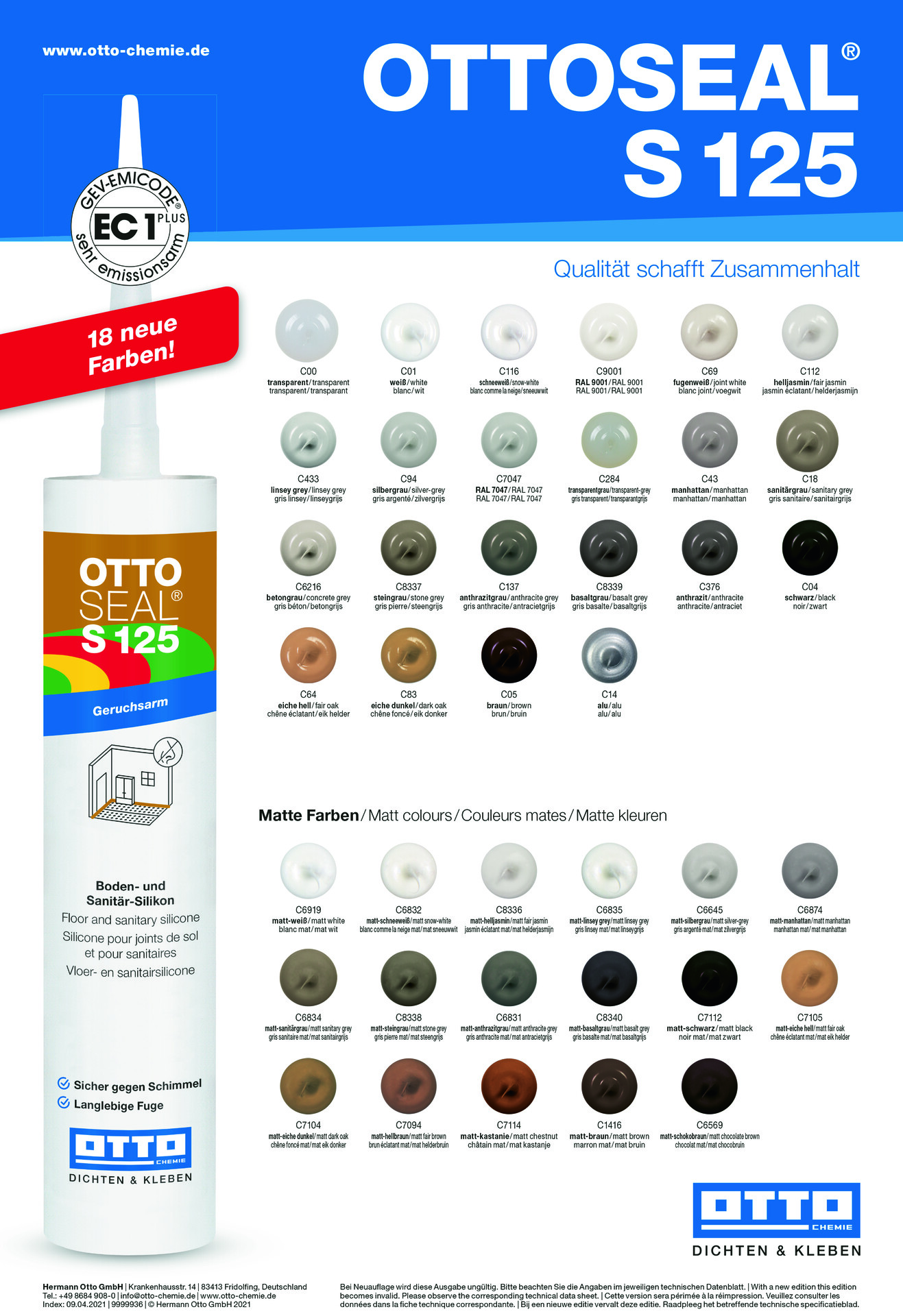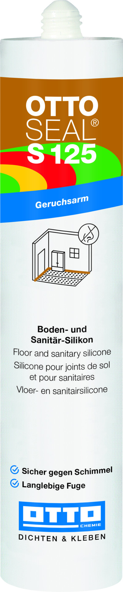 Das geruchsarme Boden- und Sanitär-Silikon OTTOSEAL® S 125 ist für verschiedene Anwendungen im Innen- und Außenbereich bestens geeignet. Sowohl bei Boden- und Anschlussfugen an Kunststoff- und Designbodenbelägen aus Gummi, Linoleum, Vinyl und PVC, als auch bei verschiedenen Anschlussfugen im Sanitärbereich, lassen sich mit OTTOSEAL® S 125 langlebige, schimmelbeständige Abdichtungen durchführen. Durch seine Verfügbarkeit in sehr vielen verschiedenen Farben sorgt der Silikon-Dichtstoff für ein stimmiges Gesamtbild. Zusätzlich ist OTTOSEAL® S 125 auch noch in matten Farbtönen verfügbar. Durch die ISEGA-Unbedenklichkeitserklärung ist OTTOSEAL® S 125 außerdem wie geschaffen für den Einsatz im lebensmittelnahen Bereich.