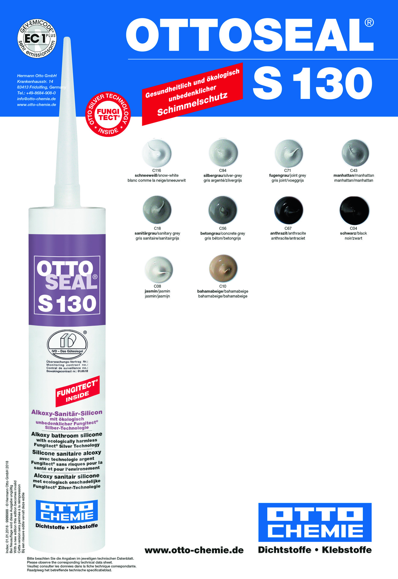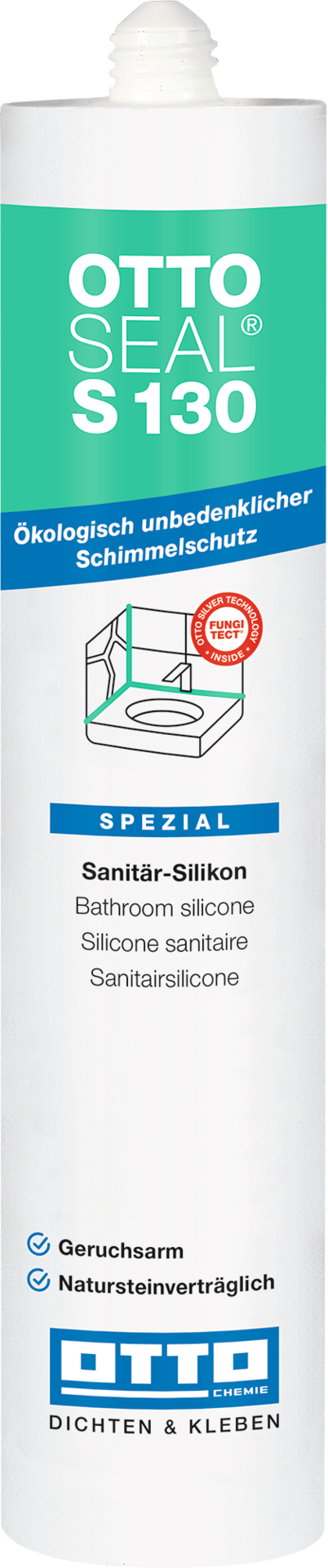 Das geruchsarme Sanitär-Silikon OTTOSEAL® S 130 ist mit der speziellen OTTO Fungitect® Silber-Technologie ausgestattet und bietet dadurch einen gesundheitlichen und ökologisch unbedenklichen Schimmelschutz. Diese wird auch bei starker Wasserbelastung nicht ausgewaschen und kann somit über längere Zeit ihre Schutzwirkung entfalten. OTTOSEAL® S 130 ist somit die perfekte Wahl für langlebige Dehn- und Anschlussfugen im Sanitärbereich. Zusätzlich ist das Sanitär-Silikon natursteinverträglich.
