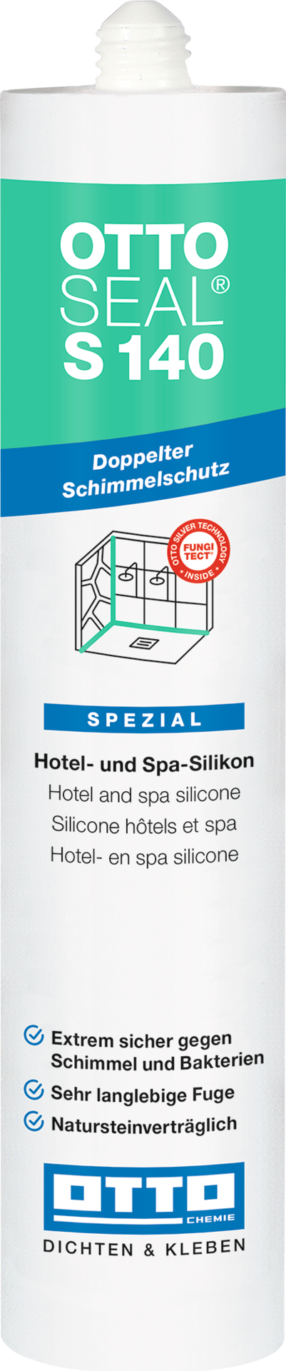 Bei dem speziellen Hotel- und Spa-Silikon OTTOSEAL® S 140 handelt es sich um einen Dichtstoff, der explizit für Dehnungs- und Anschlussfugen in dauerhaft feuchten Hygiene- oder Schwimmbadbereichen entwickelt wurde. Seine große Stärke beweist OTTOSEAL® S 140 durch seinen doppelten Schimmelschutz: Neben der fungiziden Ausrüstung gegen Schimmelbefall ist das Spezial-Silikon zusätzlich mit der ökologisch unbedenklichen OTTO Fungitect® Silber-Technologie ausgestattet. Dadurch sind auch in den besonders stark beanspruchten Bereichen von Hotels und Spa-Einrichtungen langlebige Fugen sichergestellt. Zusätzlich ist OTTOSEAL® S 140 natursteinverträglich und verursacht keine Randzonenverschmutzung.