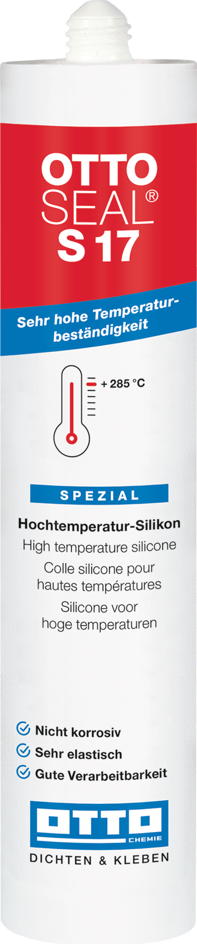 Die hohe Temperaturbeständigkeit von Ottoseal®S 17 bis zu +285°C wird ergänzt durch die Tatsache, dass der Dichtstoff nicht korrosiv ist. Die hohe Shorte-A-Härte von ca., 35 zeigt außerdem die kerbfesten Eigenschaften. Die Kombination dieser Were ergeben einen Dichtstoff, der für den Einsatz bei schwierigen Anwendungen, zB an Heizkesseln, geeignet ist.