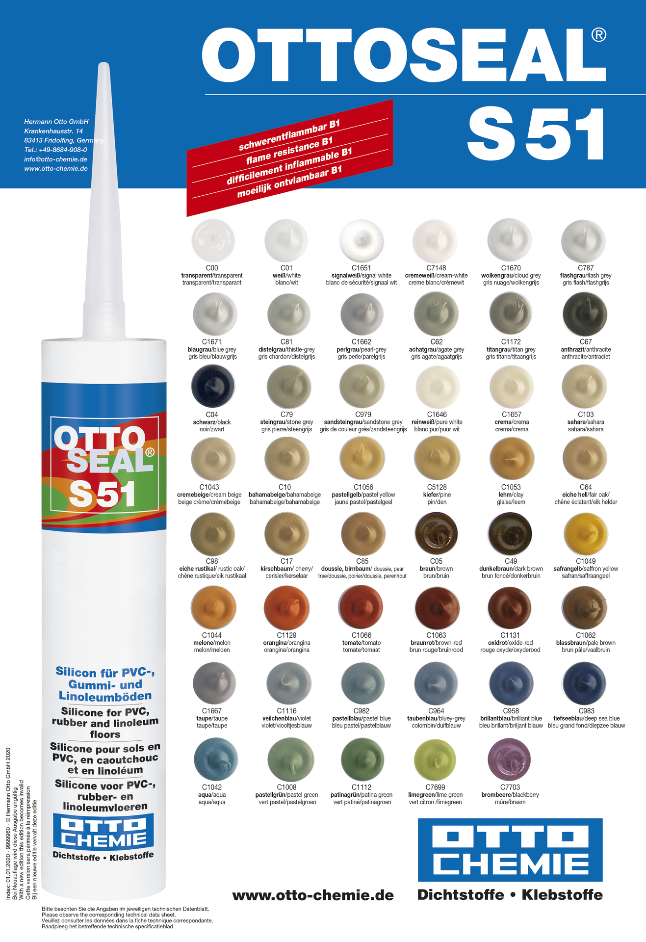 Das Premium-Kunststoffboden-Silikon OTTOSEAL® S 51 garantiert elastische Boden- und Anschlussfugen bei Kunststoff- und Designbodenbelägen aus Gummi, Linoleum, Vinyl und PVC. OTTOSEAL® S 51 ist als schwer entflammbarer Dichtstoff geprüft nach DIN 4102-B1 und ist somit auch für besondere Brandschutzanforderungen, wie etwa in öffentlichen Gebäuden, geeignet. Durch die große Anzahl verschiedener Farbtöne, die ab Lager verfügbar sind, findet sich immer ein passender Farbton zu den Trendfarben der Bodenbeläge der führenden Hersteller.