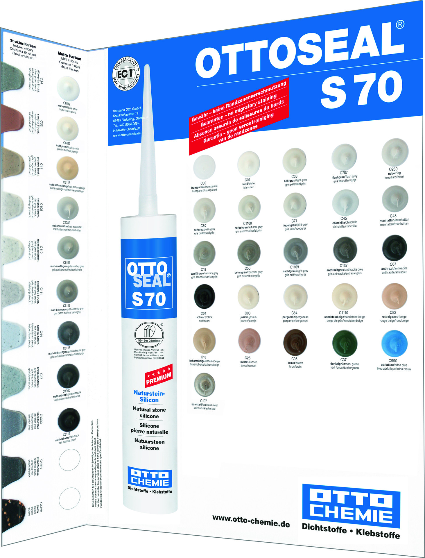 Das Premium-Naturstein-Silikon OTTOSEAL® S 70 eignet sich perfekt für alle Marmor- und Natursteine im Innen- und Außenbereich und verursacht keine Randzonenverschmutzung an den Natursteinen. OTTOSEAL® S 70 ist in einer großen Anzahl an verschiedenen Farbtönen erhältlich. Als Besonderheit hierbei sind auch matte Farbtöne und „Struktur“- Farben mit steinähnlicher Oberfläche erhältlich. Die sehr gute Witterungs-, Alterungs- und UV-Beständigkeit, sowie der Widerstand gegen Schimmelbefall, sorgen für ein langlebiges, optisch ansprechendes Gesamtbild. Achtung: Zum Glätten empfehlen wir das spezielle OTTO Marmor-Silikon-Glättmittel.